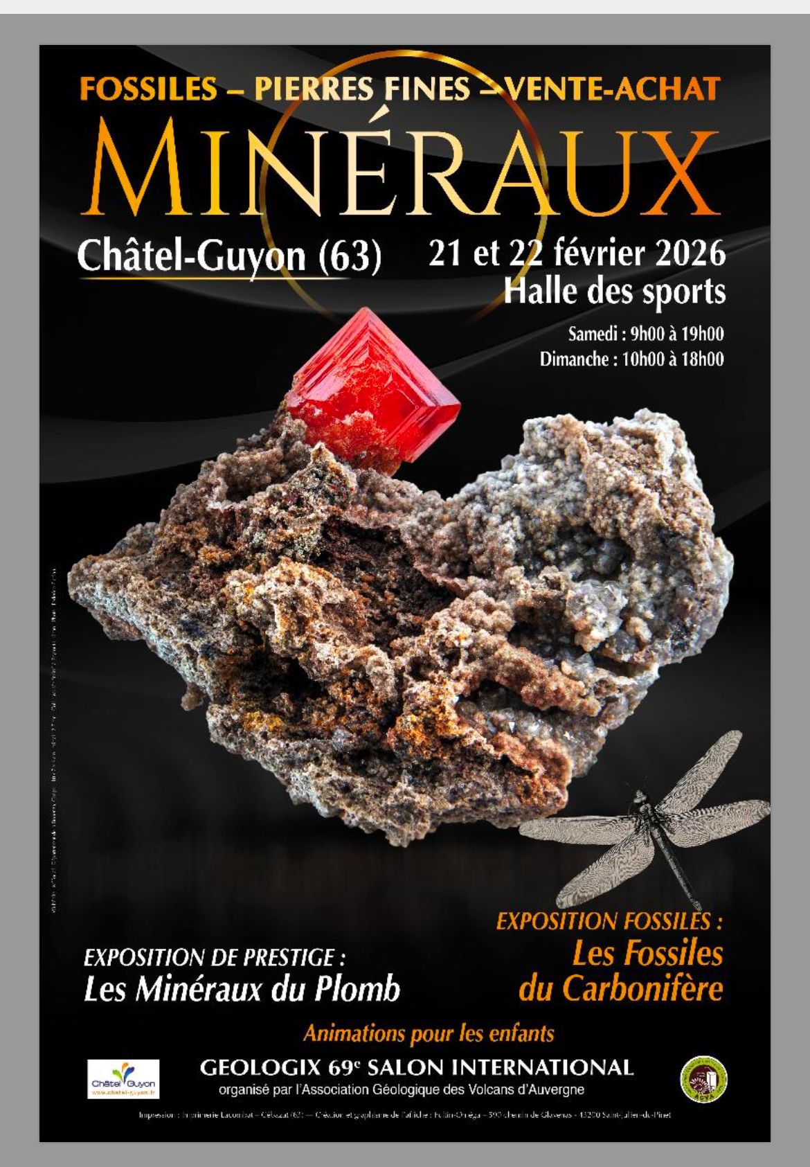 GEOLOGIX- 69ème Salon des Minéraux, Fossiles et Pierres Précieuses se déroulera à La Halle des Sports de Châtel-Guyon les 21 et 22 février 2026. Horaires le samedi de 9h00 à 19h00 et dimanche 10h00 à 18h00. Exposition sur les minéraux de Plomb et les fossiles du Carbonifère. Entrée maintenue à 3€ et gratuit pour les enfants de moins de 12 ans avec de nombreuses activités les concernant. Il y aura aussi des membres de l'AGVA qui vous ferons découvrir la microminéralogie. Venez nombreux à cet évènement devenu maintenant incontournable de toutes et tous les collectionneurs.